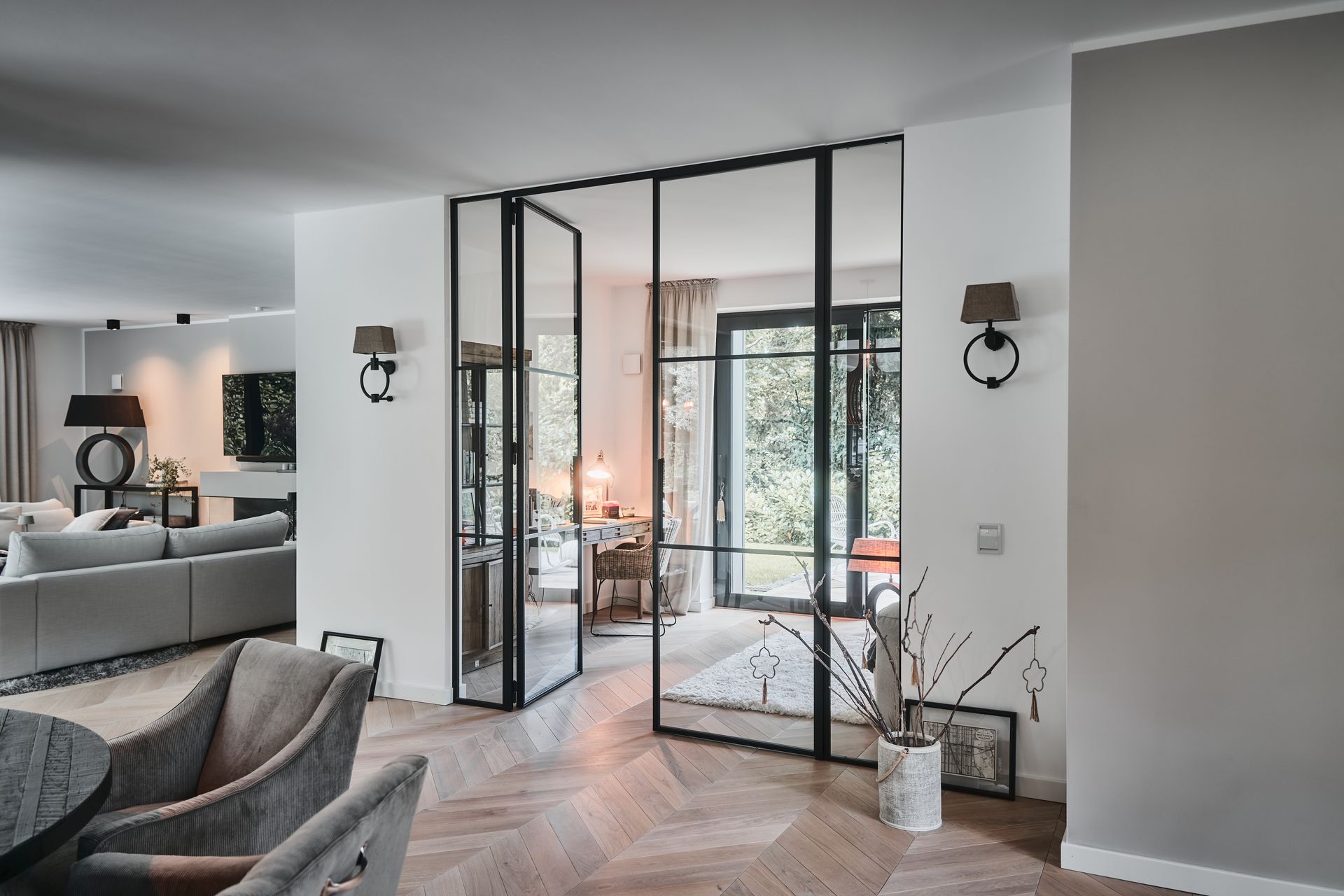 Unsere Lofttür zeichnet sich durch ihr filigranes Stahlprofil, große Glasfronten und eleganten Sprossendesign aus. In Deinem Zuhause kann die Lofttür eine verschließbare Raumtrennung kreieren – die Kombination aus Stahl und Glas verleiht den minimalistischen Loft-Style. Setze unsere Loftelemente in Deinen Räumlichkeiten als puristische Raumtrennung ein.
